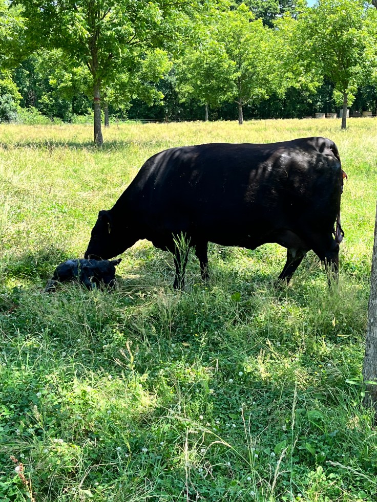 We love to watch the babies run and play together–butting heads and kicking up their heels. Soon they learn to eat grass and drink from the water trough. Later they learn to come to the coral for hay when farmer Ron calls his special cattle call. All summer they graze and grow under the pecan tree’s shade in the orchard. Then they move in the fall to the back pasture where they stay during harvest.