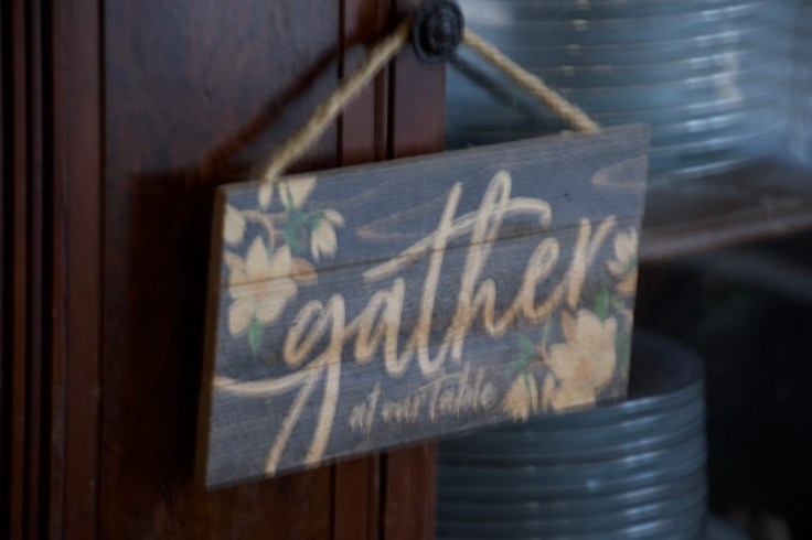 This sign is hung on china cabinet door “GATHER” is its message and when we do gather with friends and relatives, we share love and laughter and the words of our hearts around the table. Like Jesus and His disciples we eat together, which is so good for us, not just the food, but the interaction that happens, the stories we share, the faces we become more familiar with. We may have a feast. We may have only fish and bread, but we do have each other.