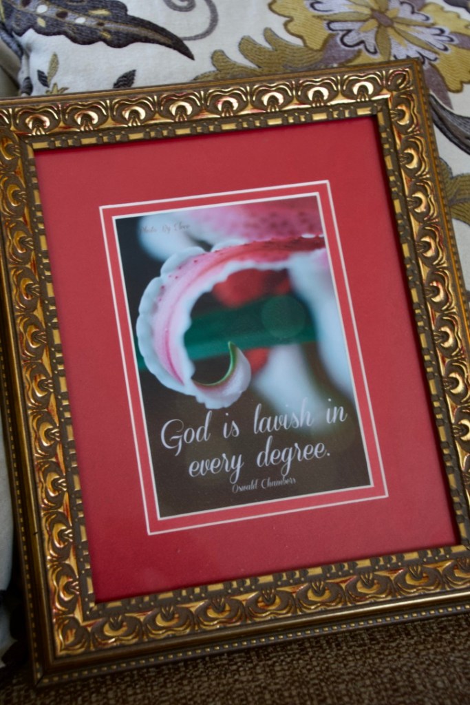 “God is lavish in every degree,” said Oswald Chambers. (These words need to be written with a florish in cursive.) I love this quote because that is how I think of God. He created lavishly. He cares for the universe and for His earth and for His people so immeasurably. I agree that He is lavish in every degree. What a great and wonderful person He is–how kind and merciful He is toward us! So I took this photo of a lily petal and added the saying so I can remind myself of the wonderful beauty of the Lord.