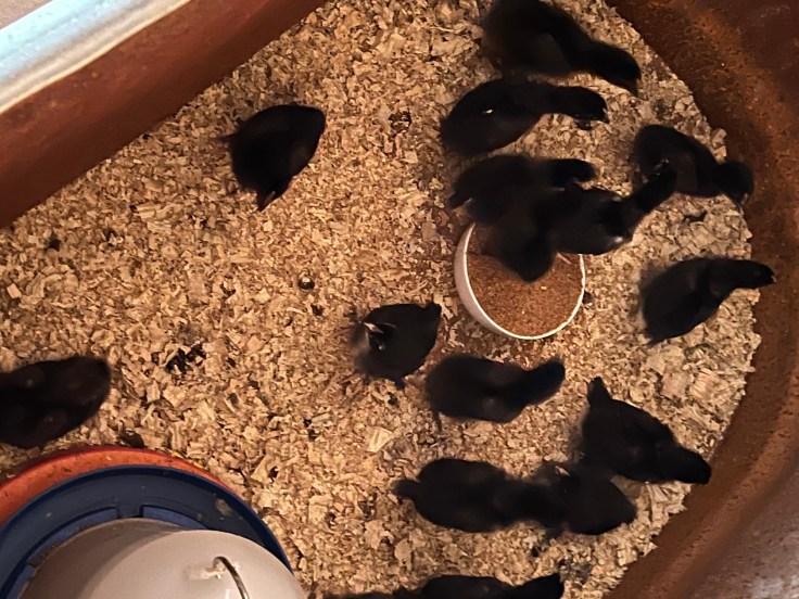 My chickens were just chicks a couple of months ago and now they are laying. The eggs were small at first but good whole eggs and so much fun. Now they are grown chickens and the eggs are medium-sized but seem a little larger every day. My daughter Brenna raised them from Tractor Supply chicks for me. Their first days they spent in a plastic tub with a heat lamp shining on them. How cute they were! Soon they were at the gangly stage and came to live on the farm.