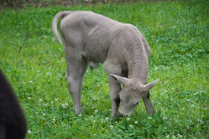 This little gray calf is happy feasting on clover in the pasture. Fresh grass delights him. He spends every day eating and growing and in a year will be big enough to go to market. In the mean time we will love watching him grow.