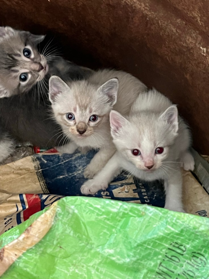 The kittens spend most of their time in the garage on feed sacks. They romp and play together all day and nap on their mama cat. In a few short weeks they’ll be going to new homes or joining the grown cats in the barn.